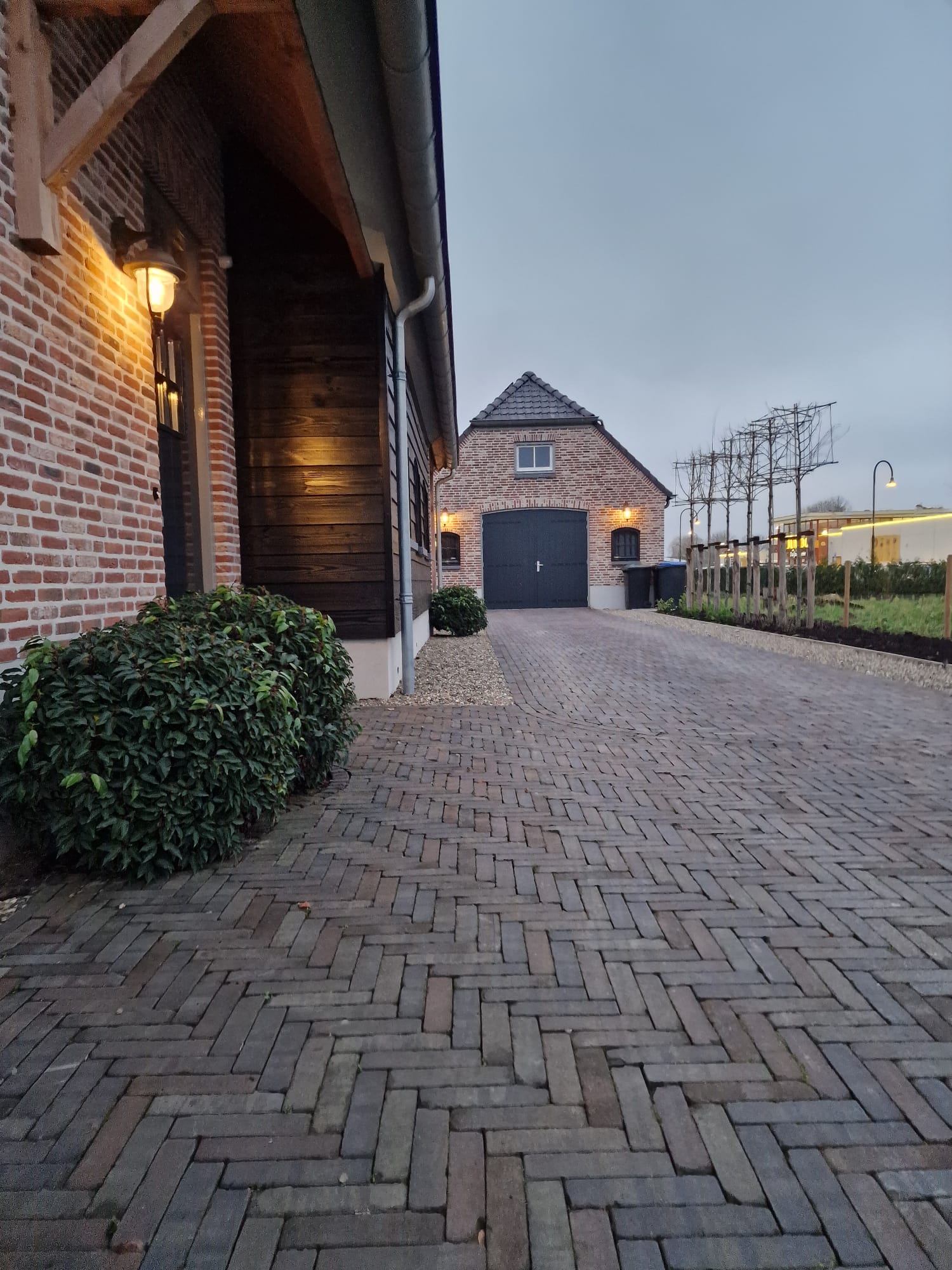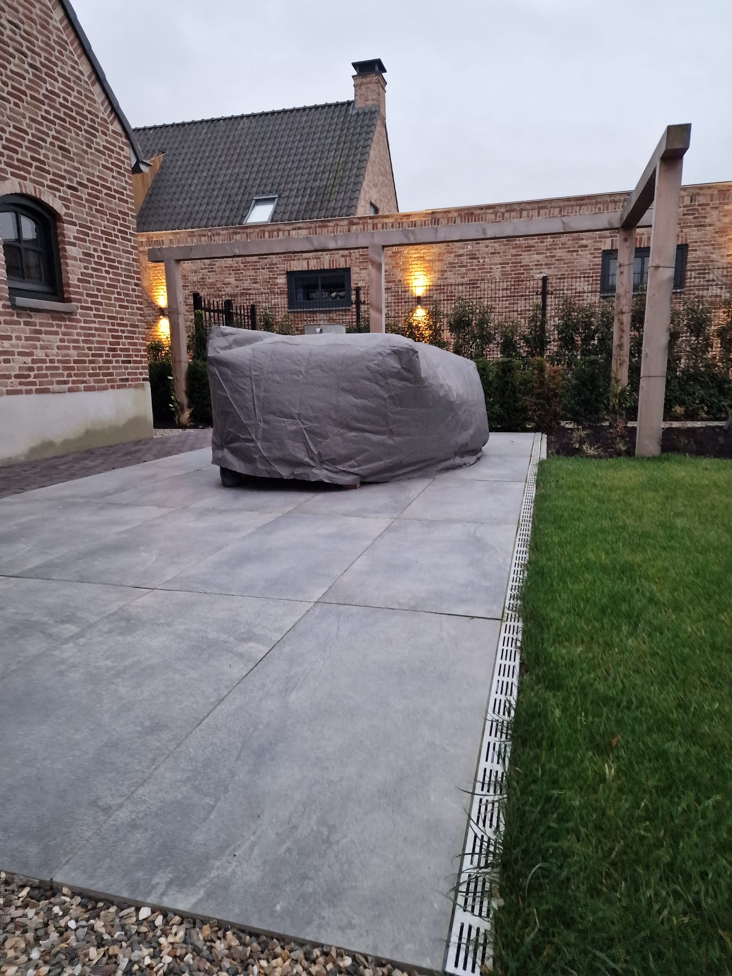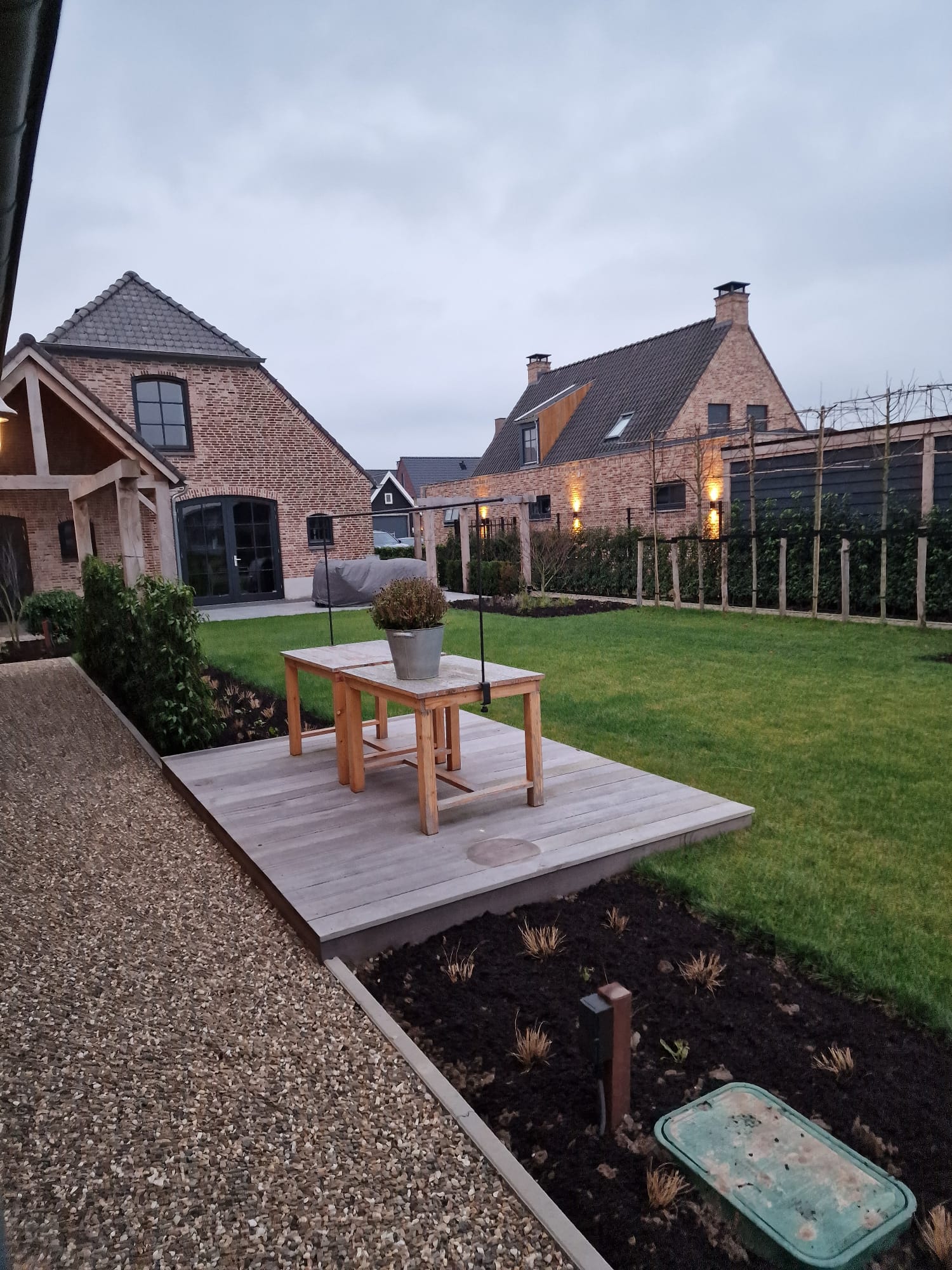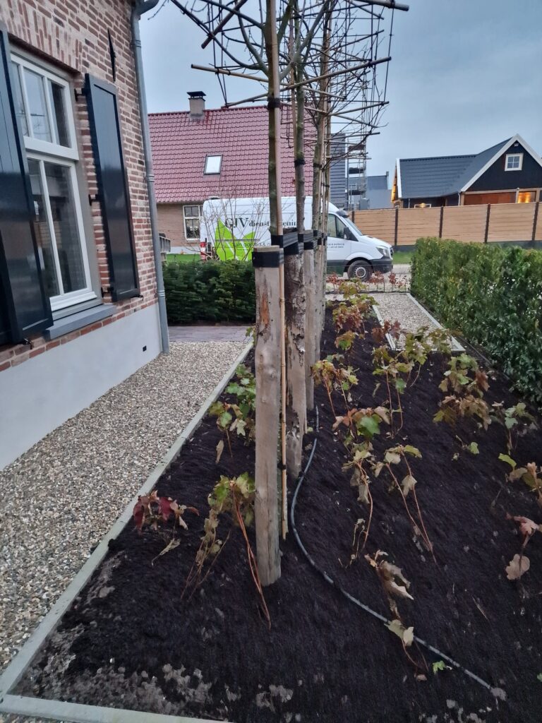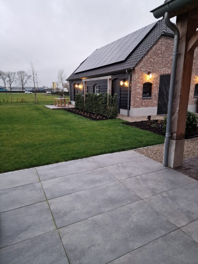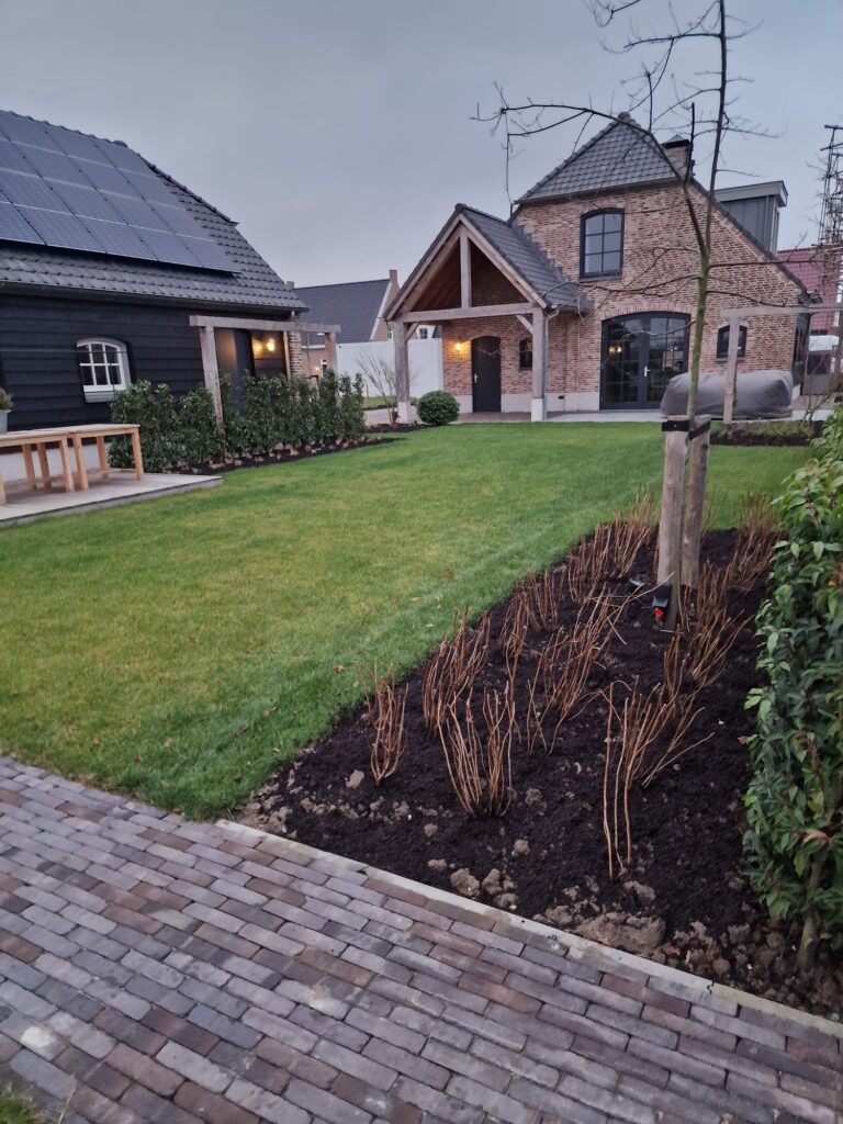 Daarnaast zijn er sfeervolle spotjes geïnstalleerd die ‘s avonds de meerstammige bomen extra laten opvallen. Dit creëert een warme en gezellige ambiance in de tuin wanneer het donker is.