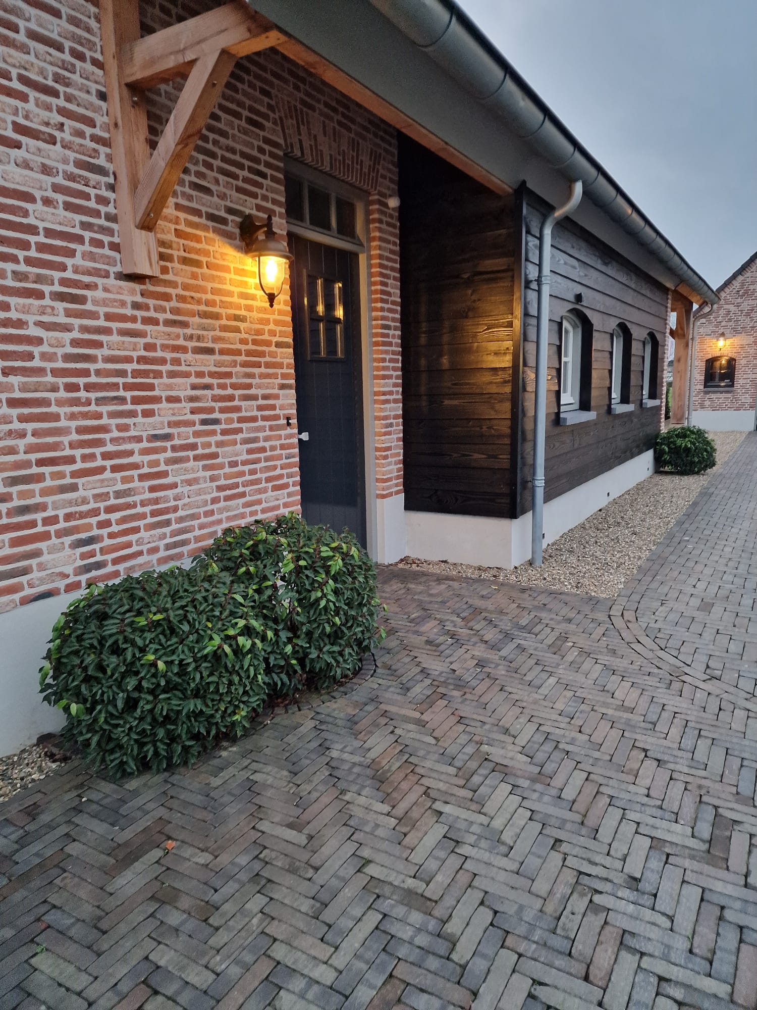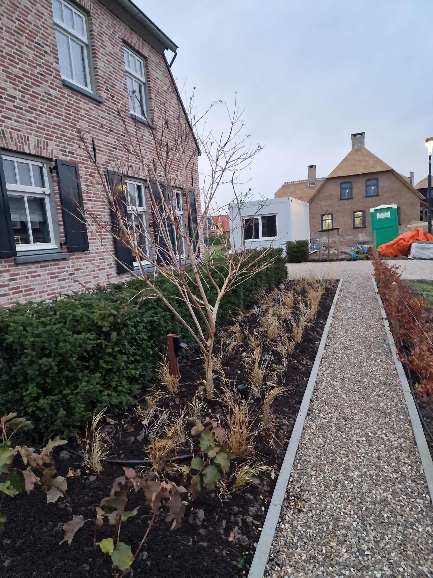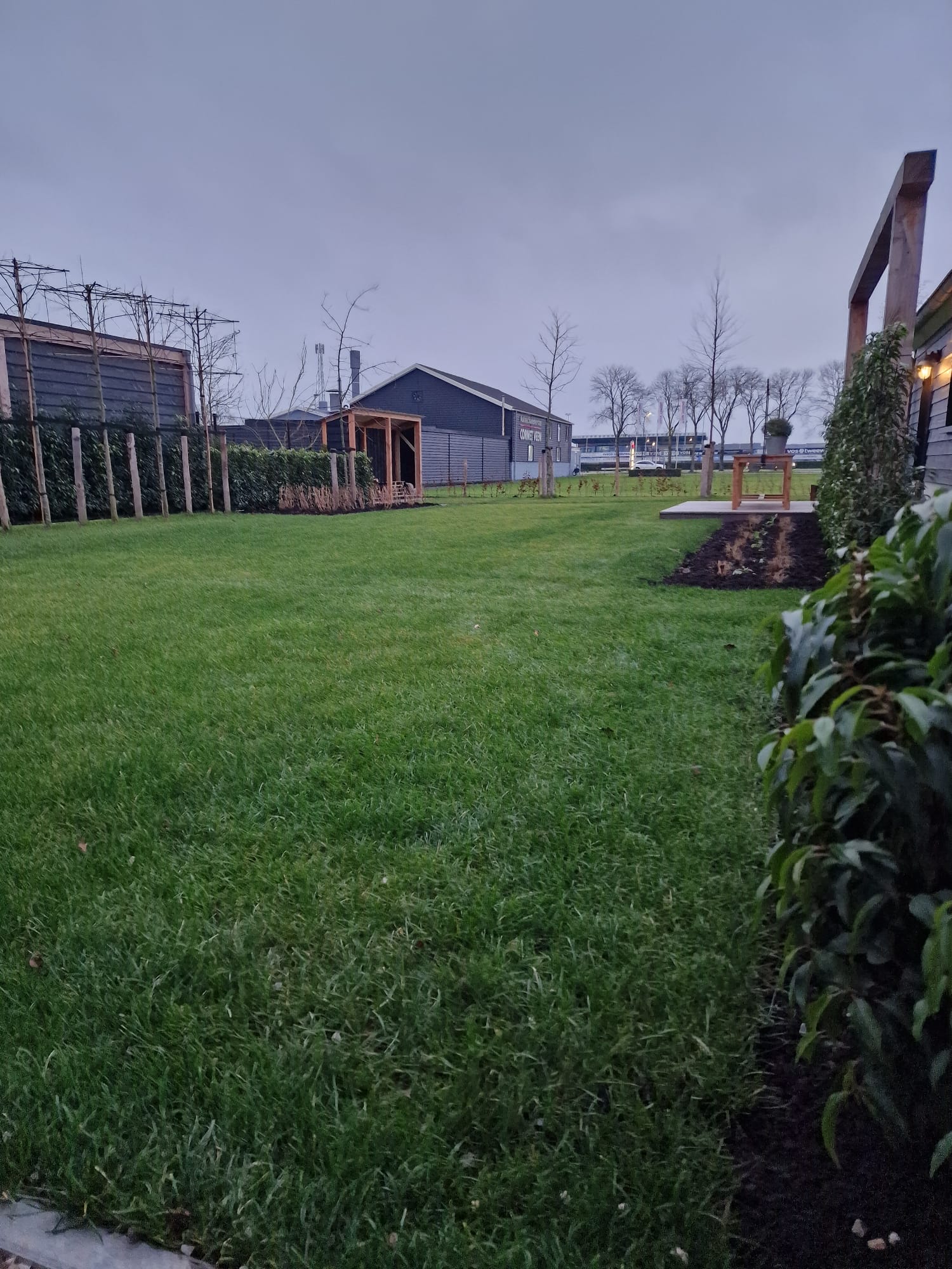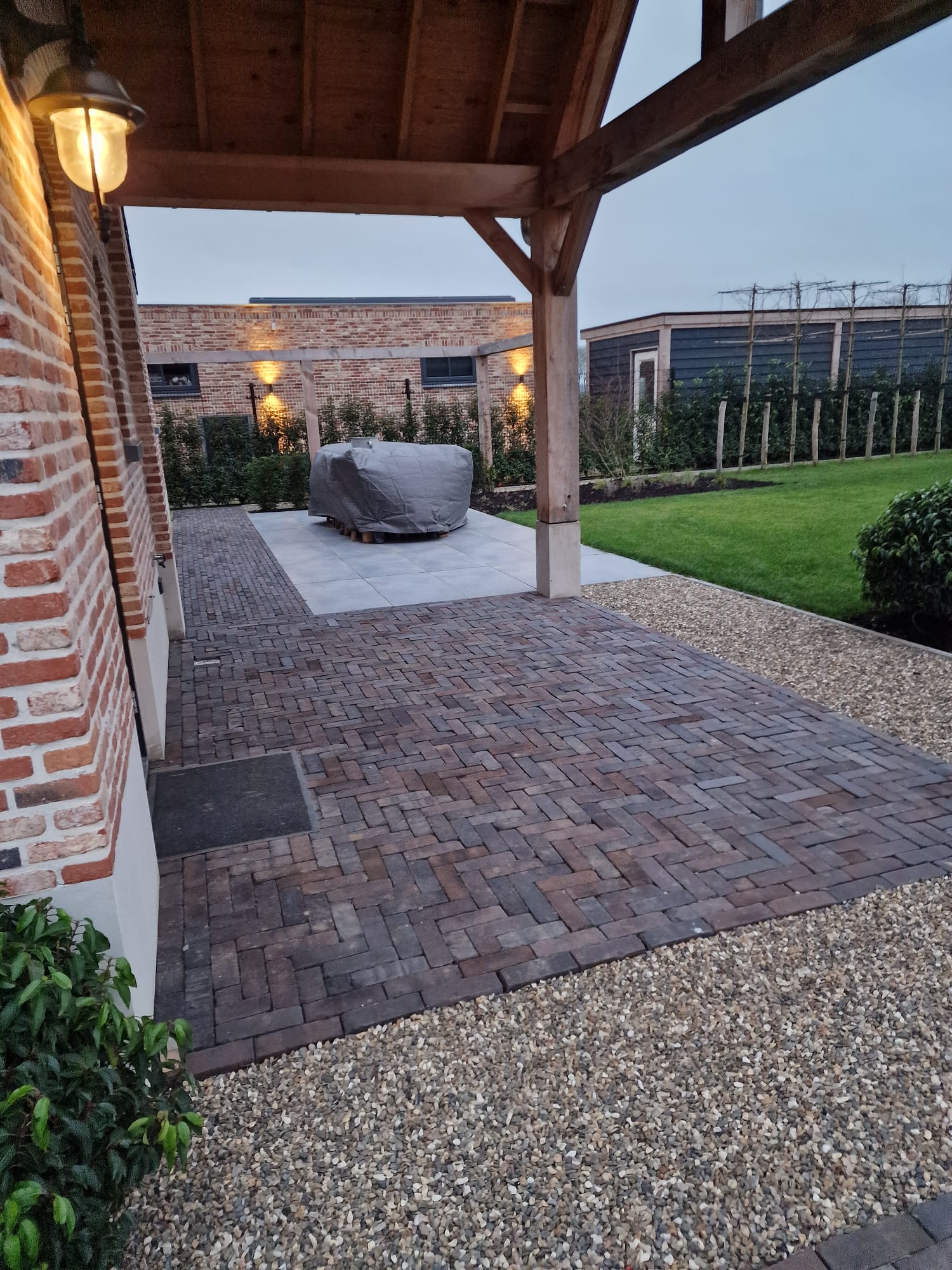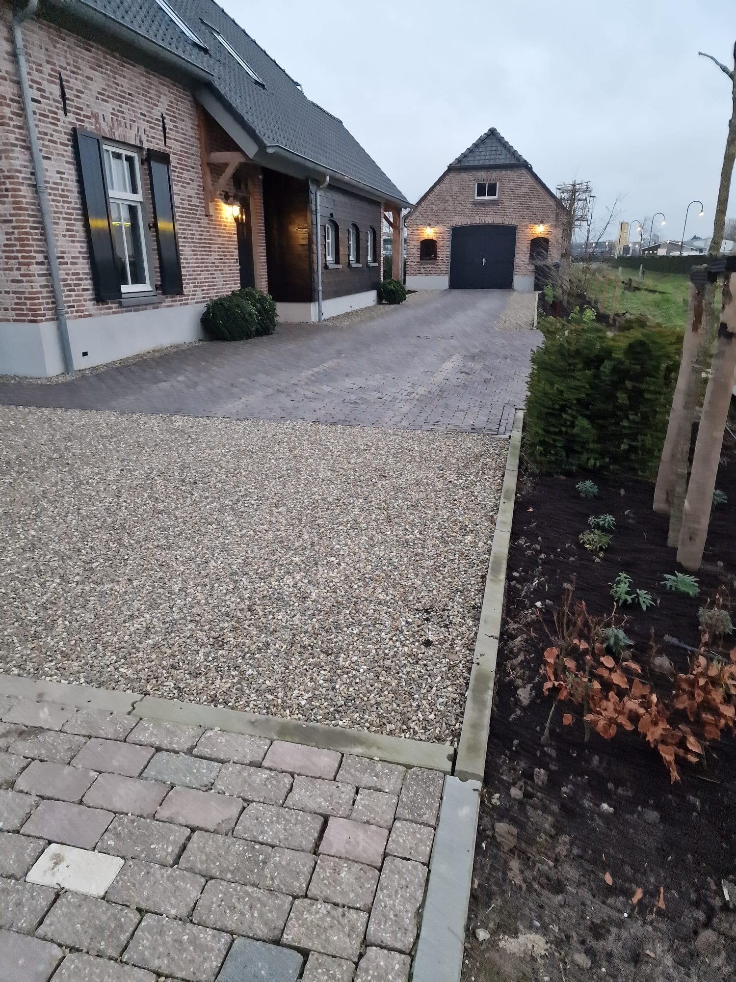 Daarnaast zijn er sfeervolle spotjes geïnstalleerd die ‘s avonds de meerstammige bomen extra laten opvallen. Dit creëert een warme en gezellige ambiance in de tuin wanneer het donker is.