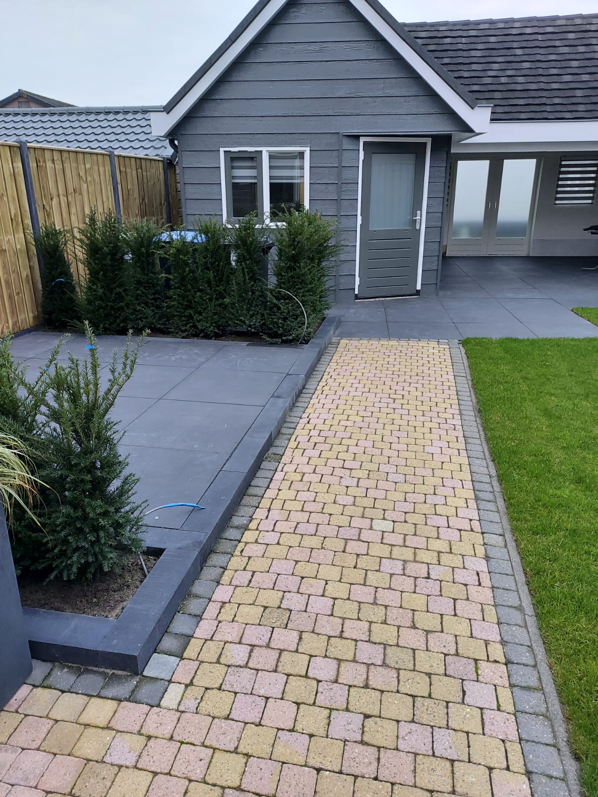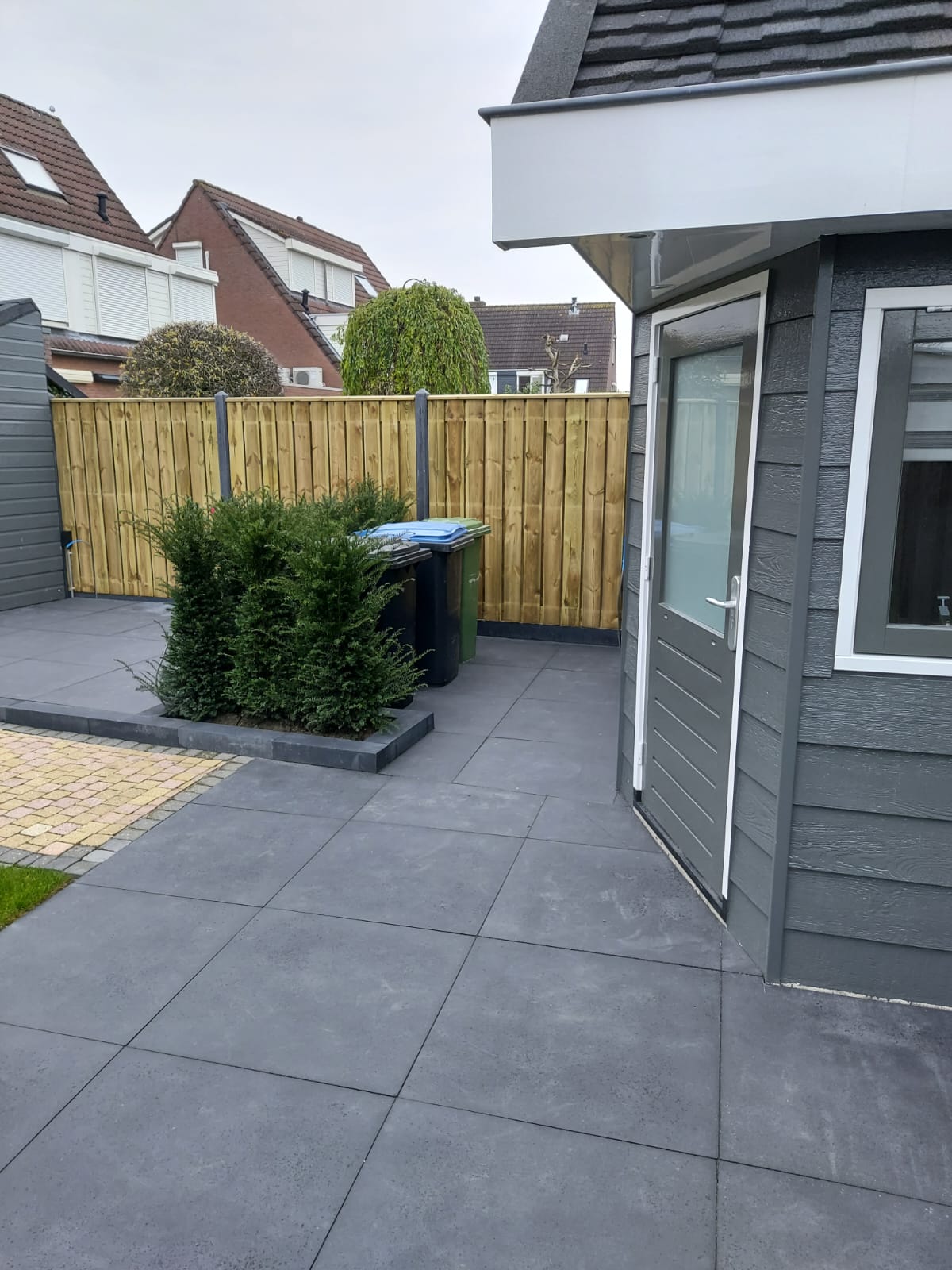 In deze achtertuin hebben we een deel van de bestrating en gazon mogen aanleggen. Hierbij hebben we voor een 80×80 tegel gekozen om rust te creëren. We hebben rond de containers een taxushaag geplant zodat deze netjes uit het zicht staan. Kortom een rustige en onderhoudsvriendelijke tuin.