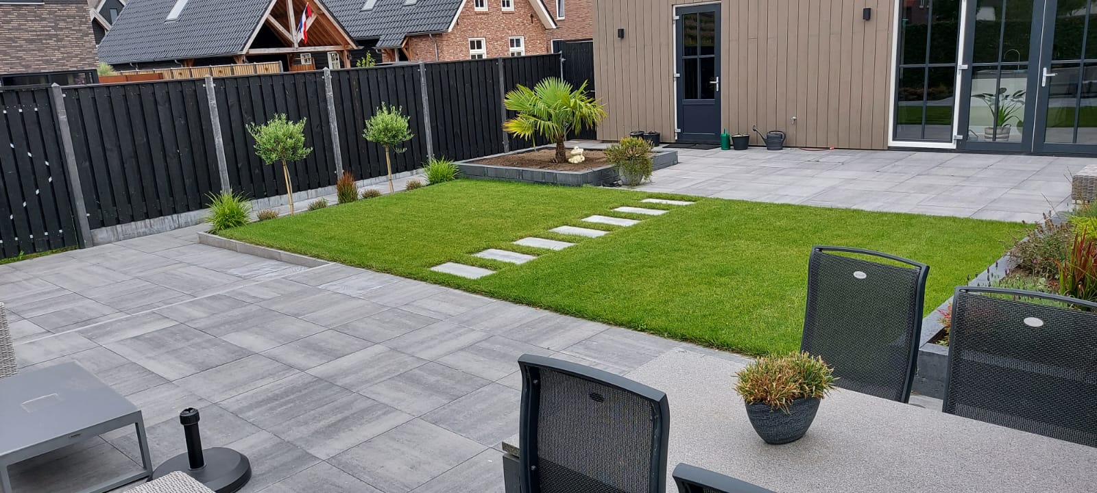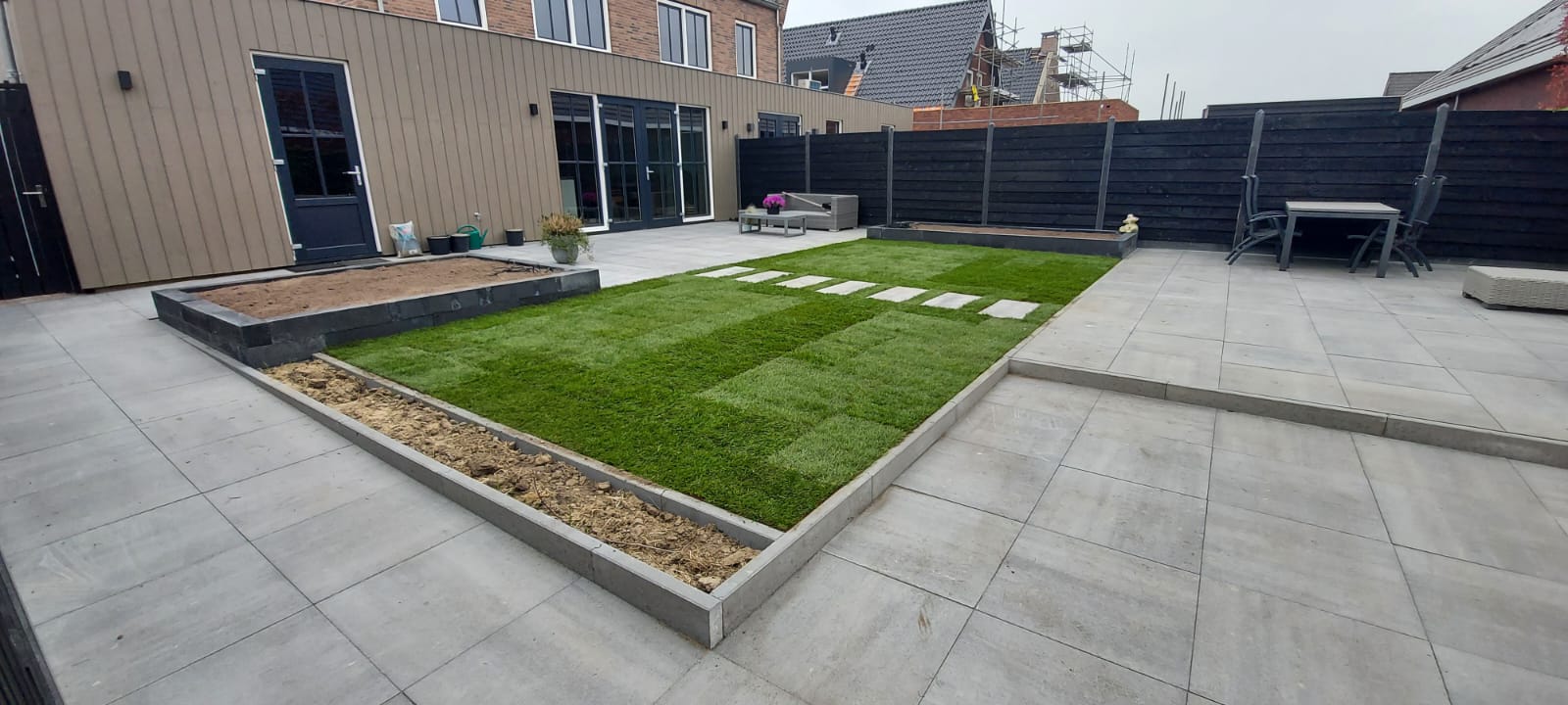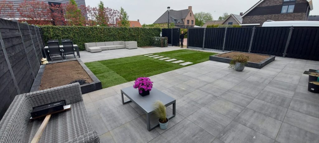 Bij deze nieuwbouwwoning mochten wij de oprit bestraten en in de achtertuin de bestrating en gazon aanleggen. Voor de oprit hebben we gekozen voor een meerkleurige dikformaat steen, die terugkomt in de buitenmuur van de woning om zo een strak geheel te krijgen. De klant had de wens om een groot terras in de achtertuin te hebben om van de zon te kunnen genieten. Daarom hebben we gekozen voor 60×60 tegels met verhoogde bloembakken om een speels effect in de tuin te krijgen.