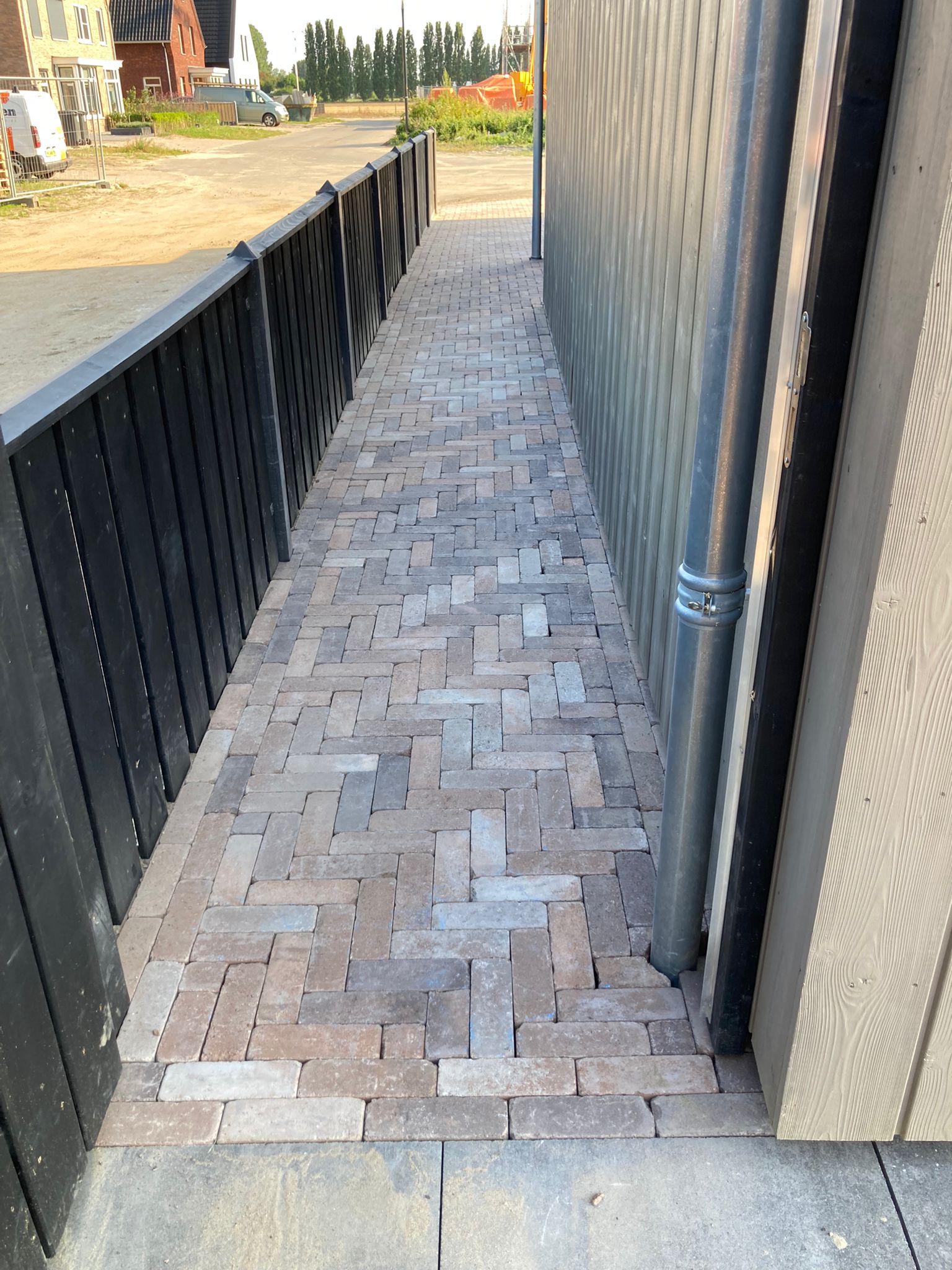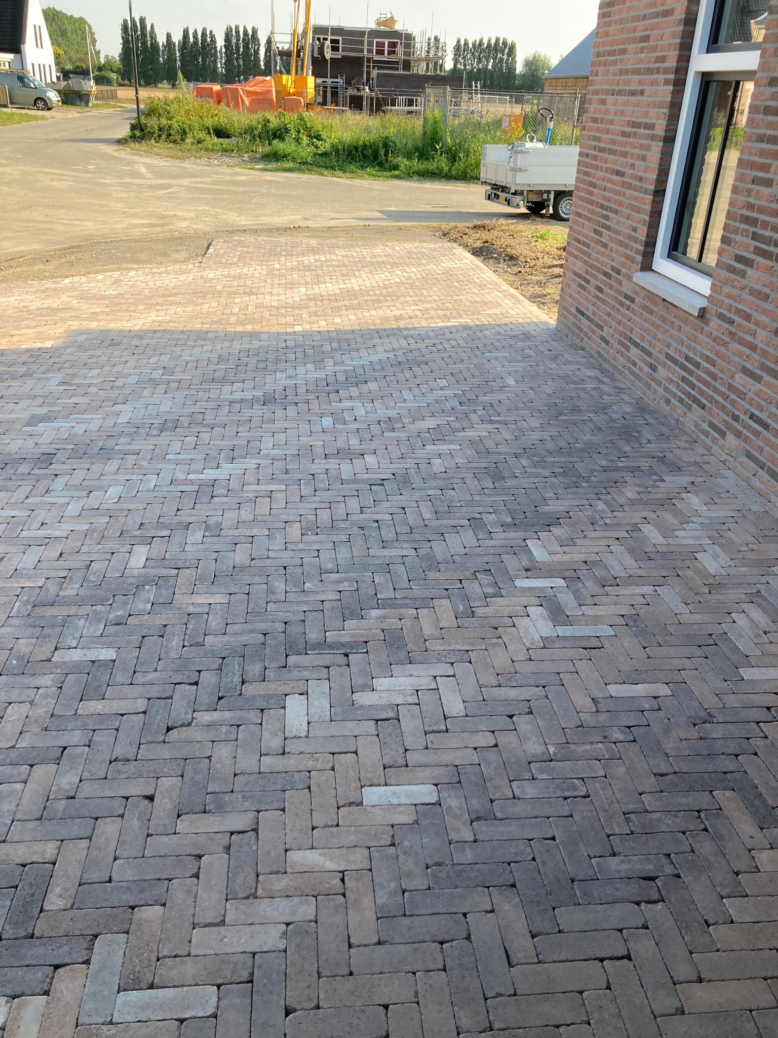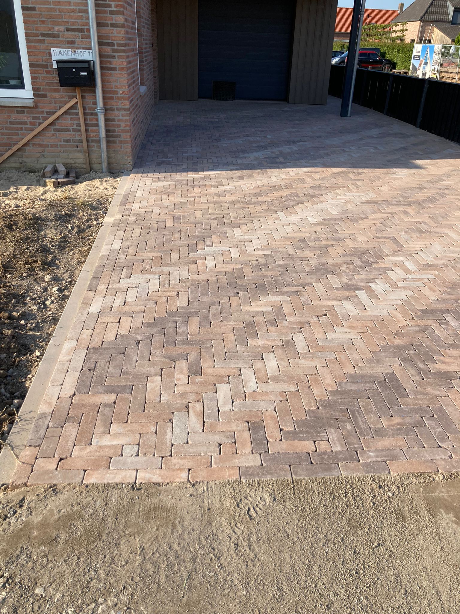 Bij deze nieuwbouwwoning mochten wij de oprit bestraten en in de achtertuin de bestrating en gazon aanleggen. Voor de oprit hebben we gekozen voor een meerkleurige dikformaat steen, die terugkomt in de buitenmuur van de woning om zo een strak geheel te krijgen. De klant had de wens om een groot terras in de achtertuin te hebben om van de zon te kunnen genieten. Daarom hebben we gekozen voor 60×60 tegels met verhoogde bloembakken om een speels effect in de tuin te krijgen.